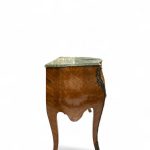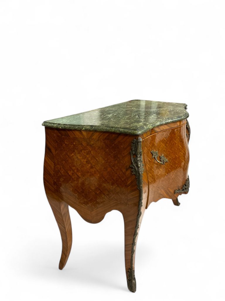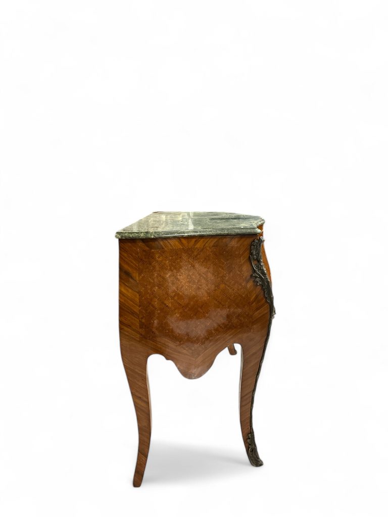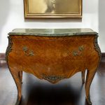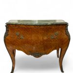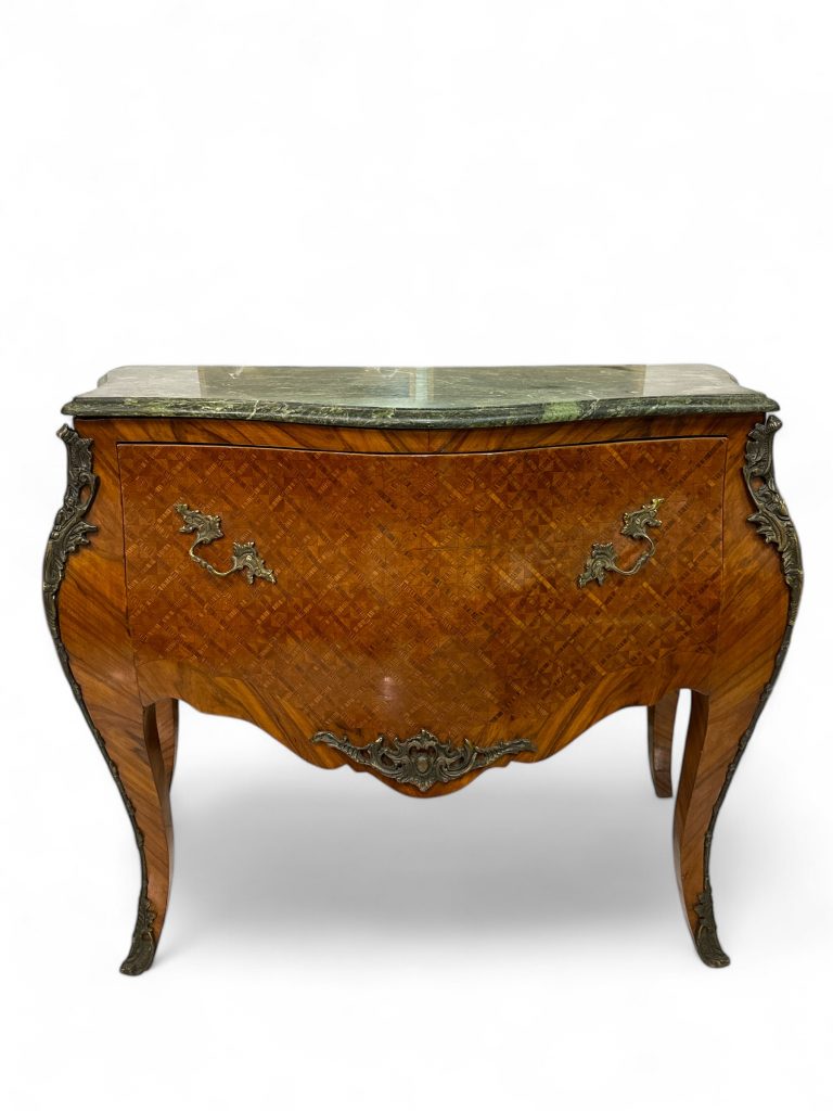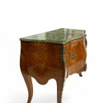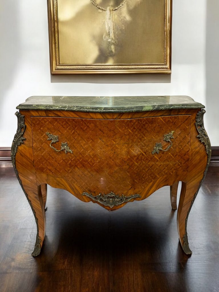 Questo elegante comò in stile Luigi XV, realizzato tra la fine del XVIII e l’inizio del XIX secolo, rappresenta una perfetta combinazione di arte e funzionalità. La struttura bombata in legno intarsiato, arricchita da un piano in marmo verde sagomato e dettagli in bronzo cesellato, esprime l’armonia e la raffinatezza del gusto Rococò. Le linee mosse e le decorazioni floreali aggiungono un tocco di esclusività, rendendolo ideale per ambienti classici o per creare un raffinato contrasto in contesti contemporanei.
