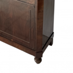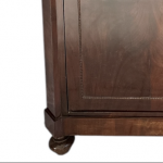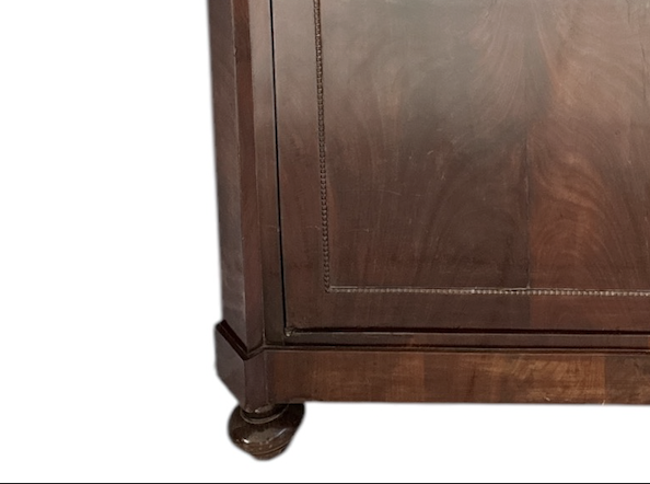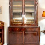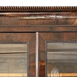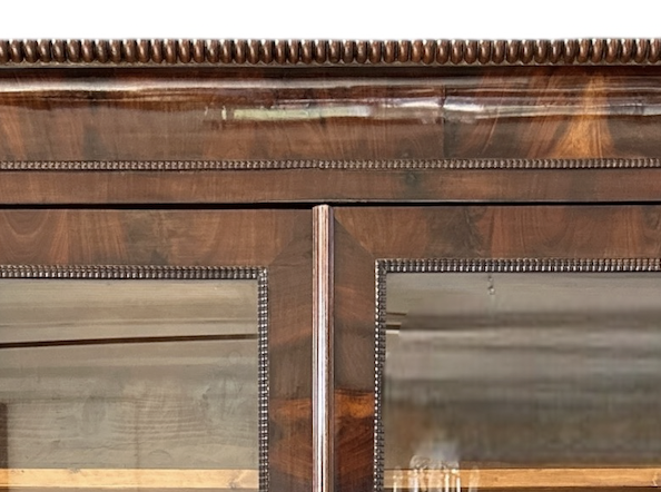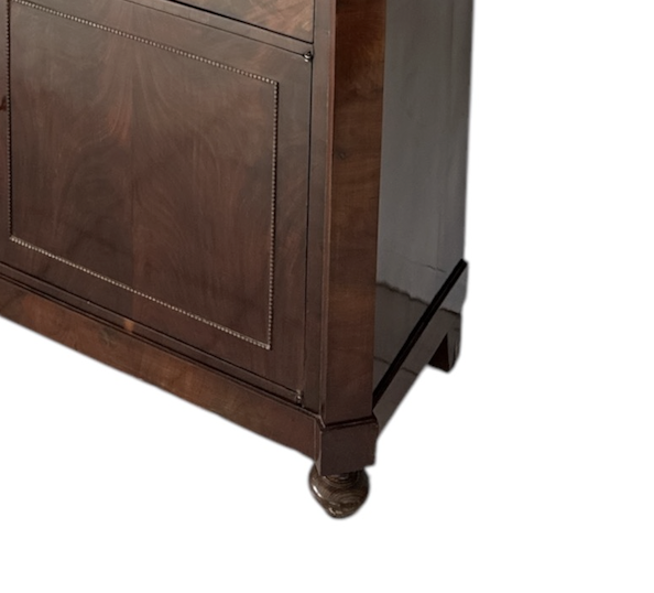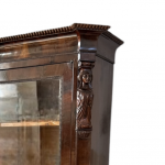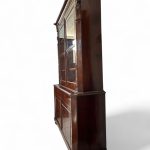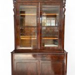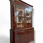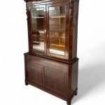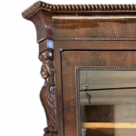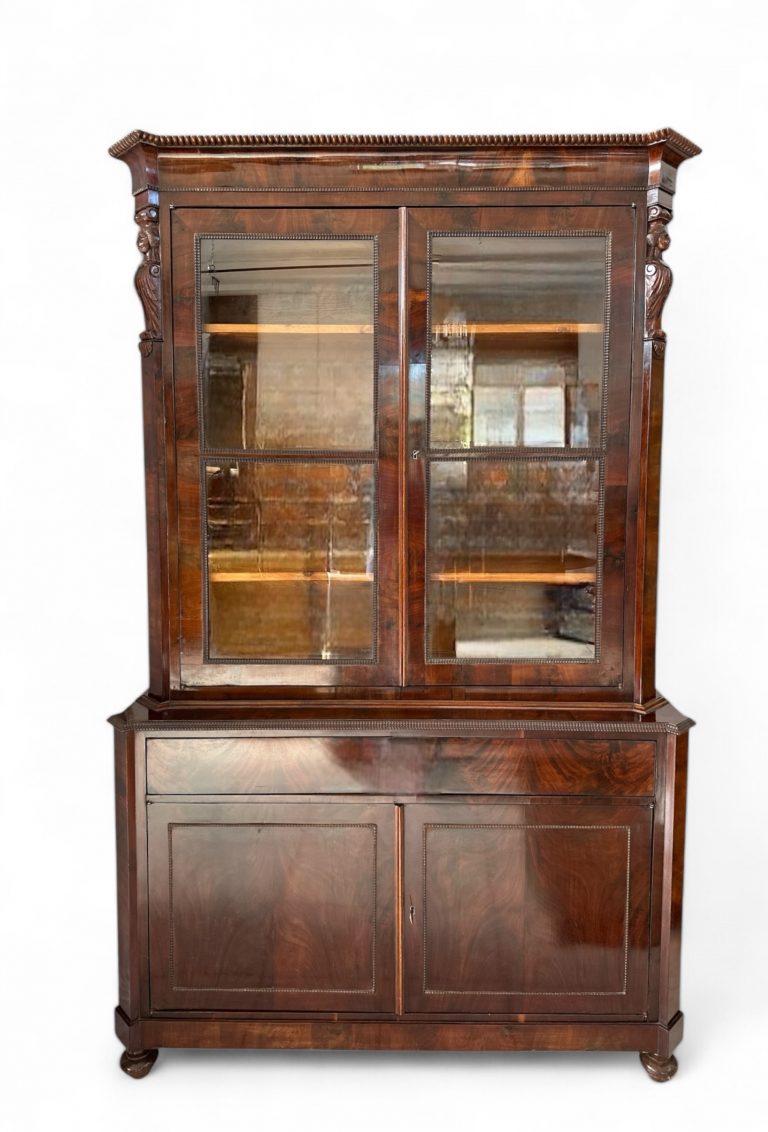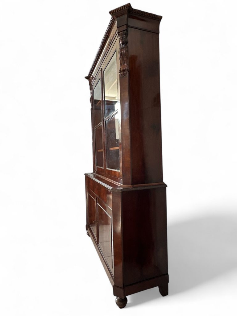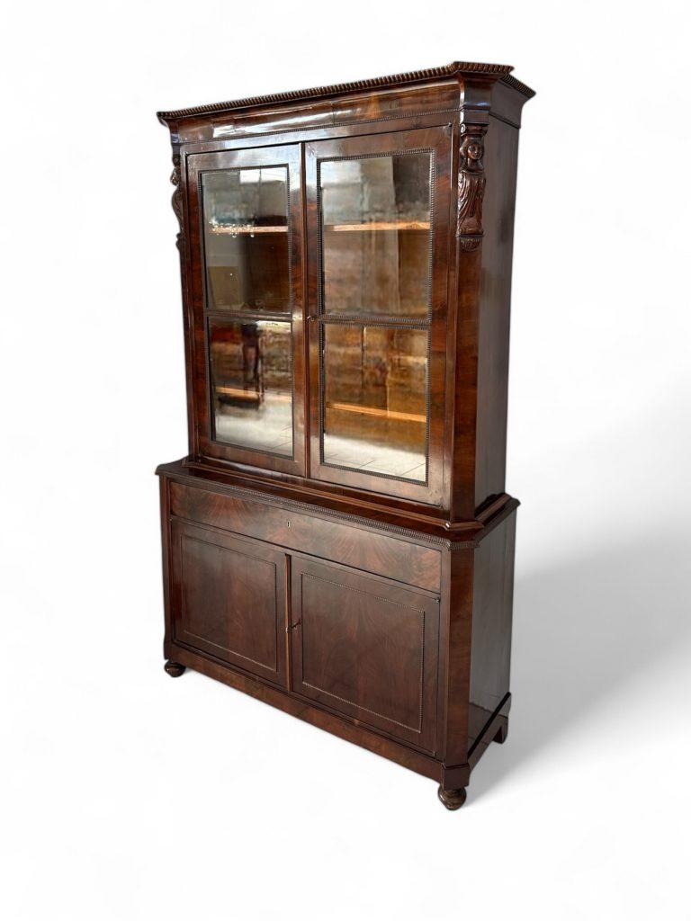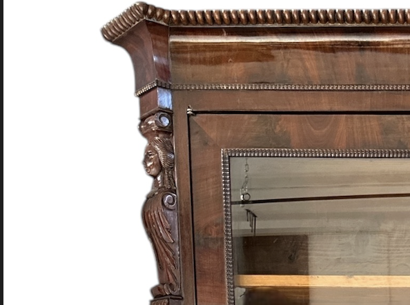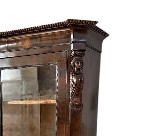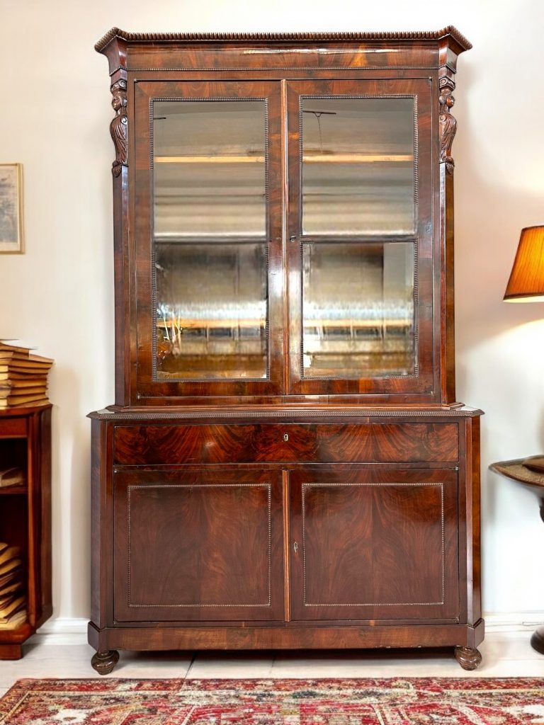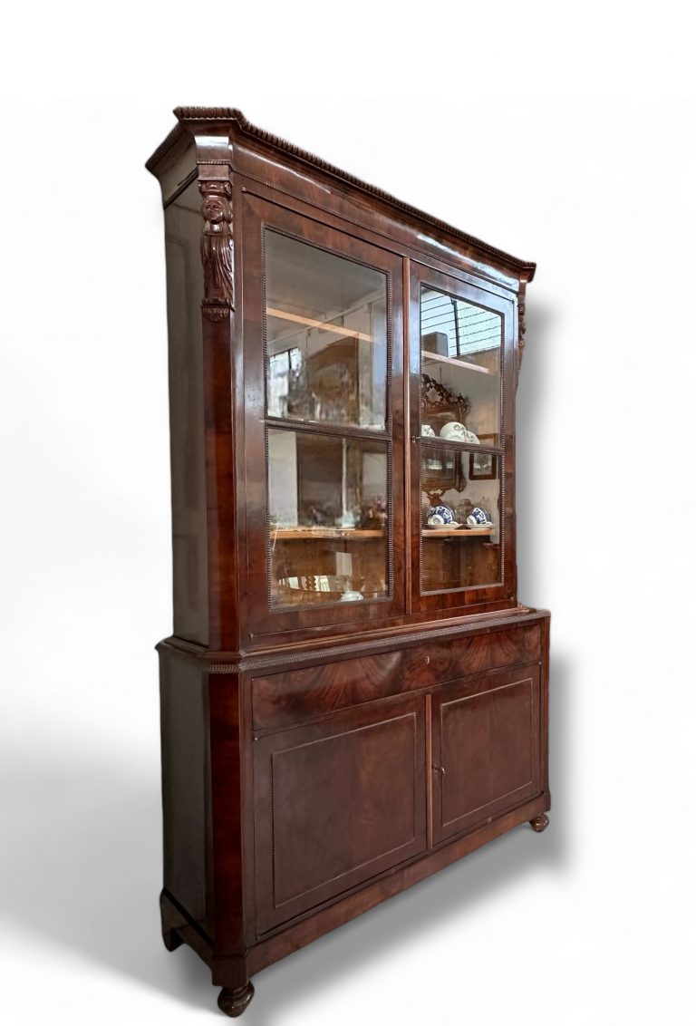 Elegante credenza con vetrina in pregiato legno di mogano, risalente al XIX secolo e realizzata in stile Impero/Neoclassico. Caratterizzata da una lavorazione raffinata, presenta una parte superiore con vetrina a due ante, ideale per esporre oggetti decorativi o libri, e una parte inferiore con due ante in legno massello e un cassetto. Le colonne laterali, decorate con figure scolpite, e la cornice superiore con intagli a dentelli, ne sottolineano il pregio artigianale, rendendola perfetta per ambienti eleganti.