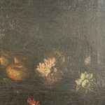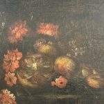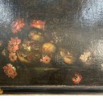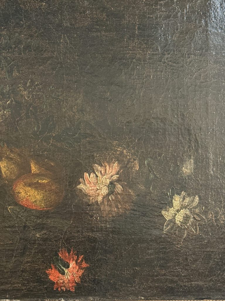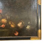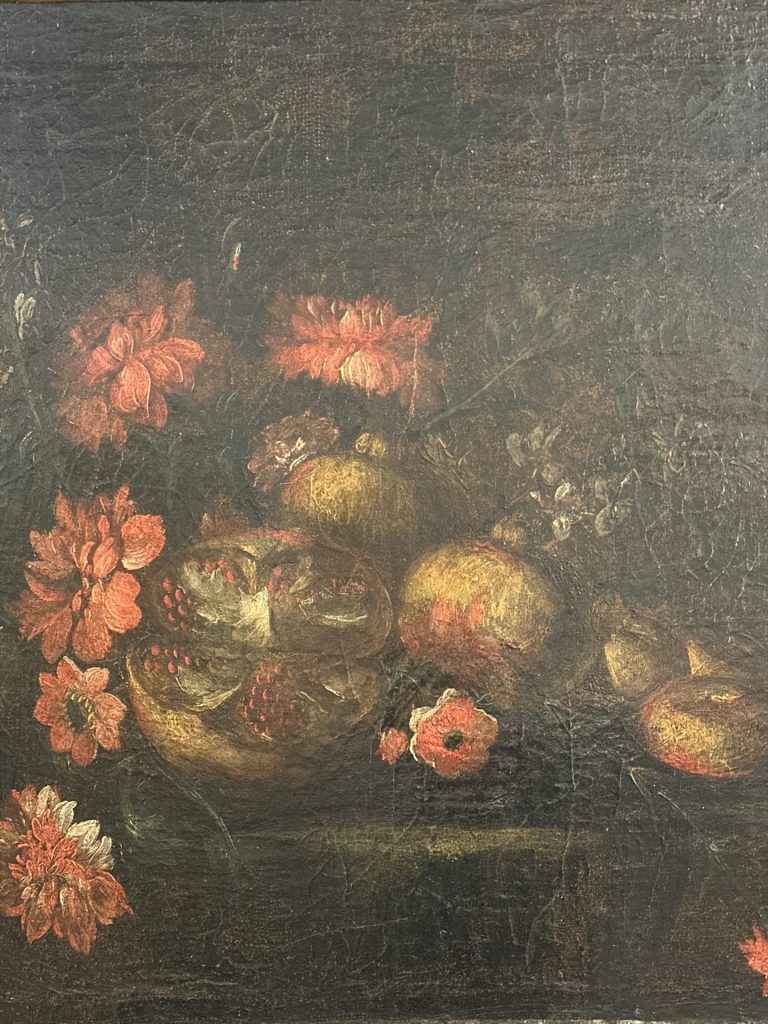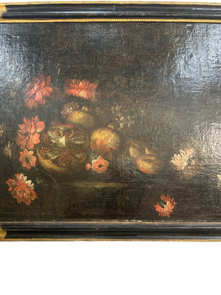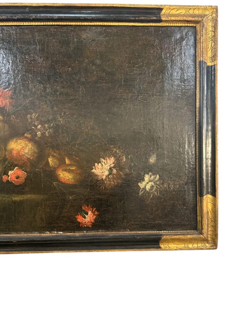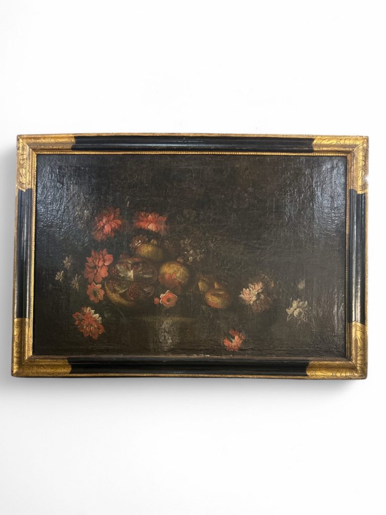 Dipinto del XVIII secolo raffigurante una raffinata natura morta con frutta e fiori. Le dimensioni generose e l'uso sapiente del chiaroscuro donano profondità alla composizione, esaltando i dettagli dei melograni, delle mele e dei fiori vivaci. La cornice originale in legno dorato e nero impreziosisce l'opera, rendendola un autentico capolavoro d'epoca, perfetto per ambienti sofisticati.
