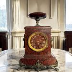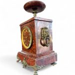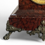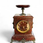 Questo splendido orologio da camino è un esempio di alta maestria artigianale europea della seconda metà del XIX secolo. Rappresenta il gusto decorativo del periodo Napoleone III (Secondo Impero), famoso per l’uso di materiali preziosi e decorazioni raffinate. L’orologio è realizzato in marmo rosso brecciato, probabilmente di origine francese o italiana, e presenta dettagli decorativi in bronzo cesellato e dorato. La sua forma elegante e le sue decorazioni ricche ne fanno un elemento d’arredo distintivo e scenografico.