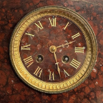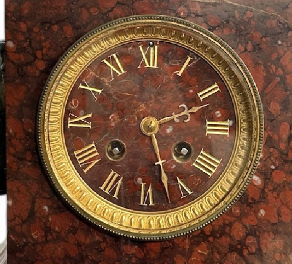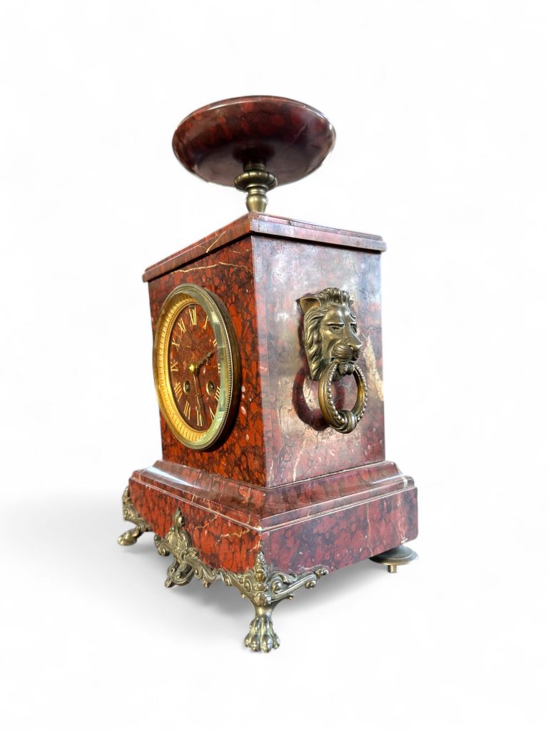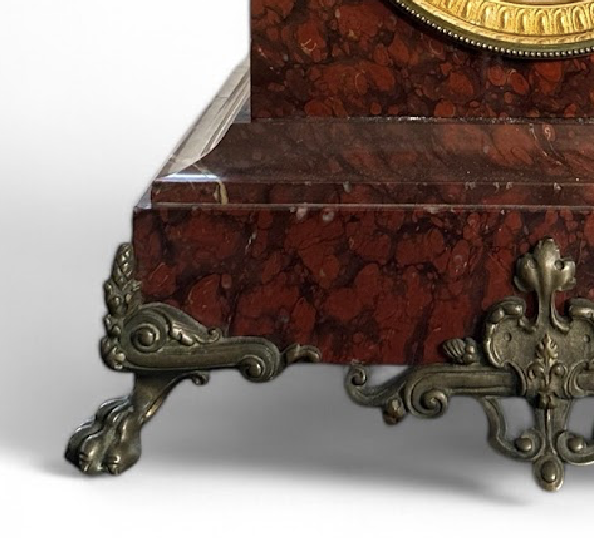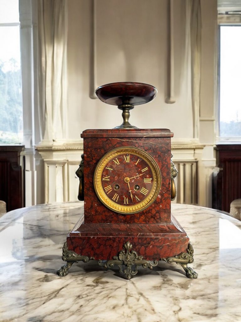 • Quadrante: Il quadrante è circolare, realizzato nello stesso marmo rosso della cassa, e decorato con numeri romani dorati. È incorniciato da un bordo ornamentale in bronzo lavorato con finezza. Le lancette sono sottili e in stile classico.