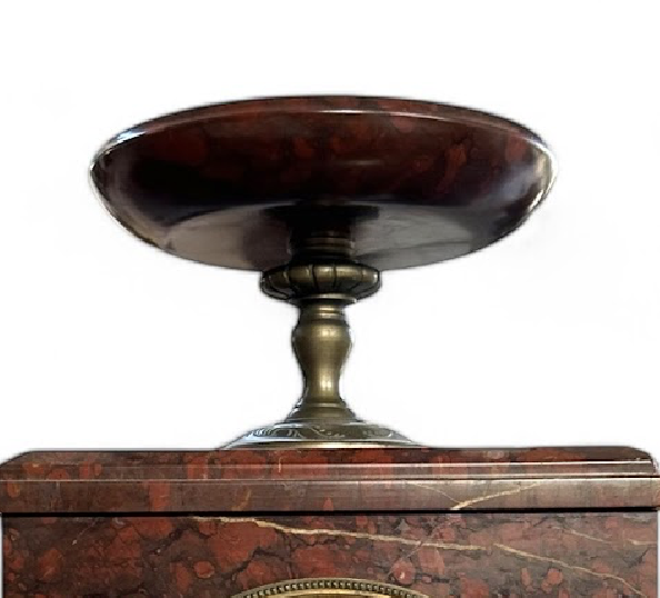 • Decorazione Superiore: La parte superiore dell'orologio è caratterizzata da una coppa decorativa in marmo rosso, posizionata su un elegante piedistallo in bronzo.