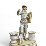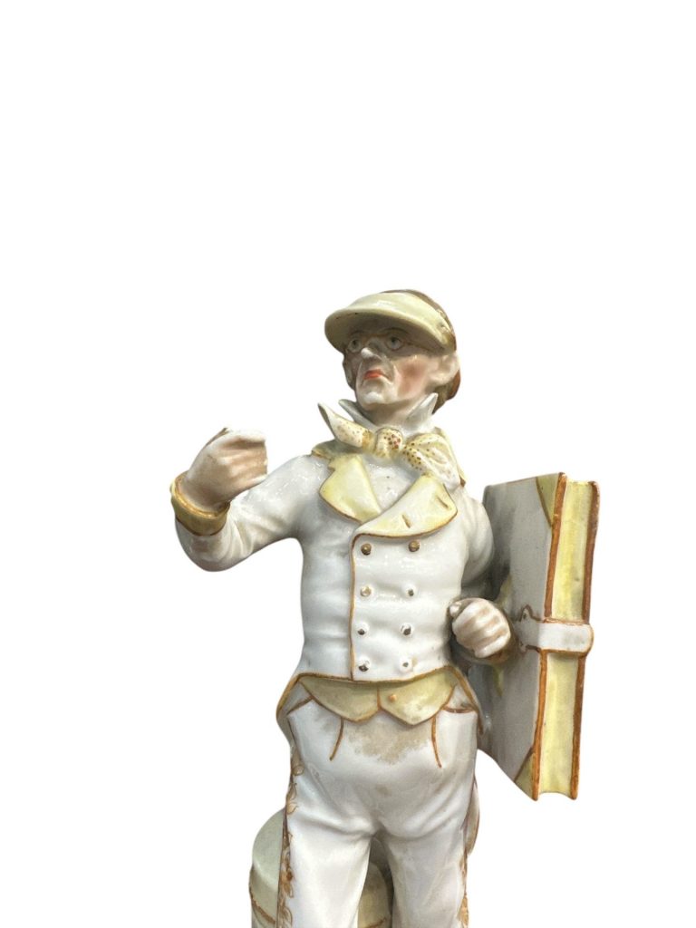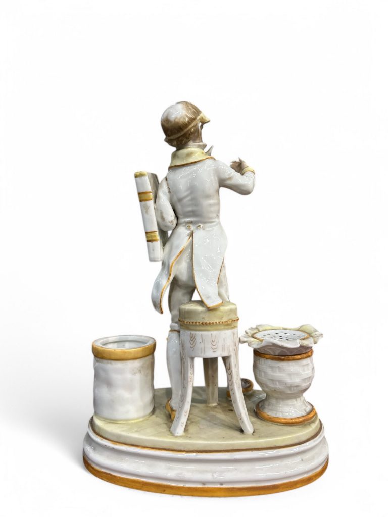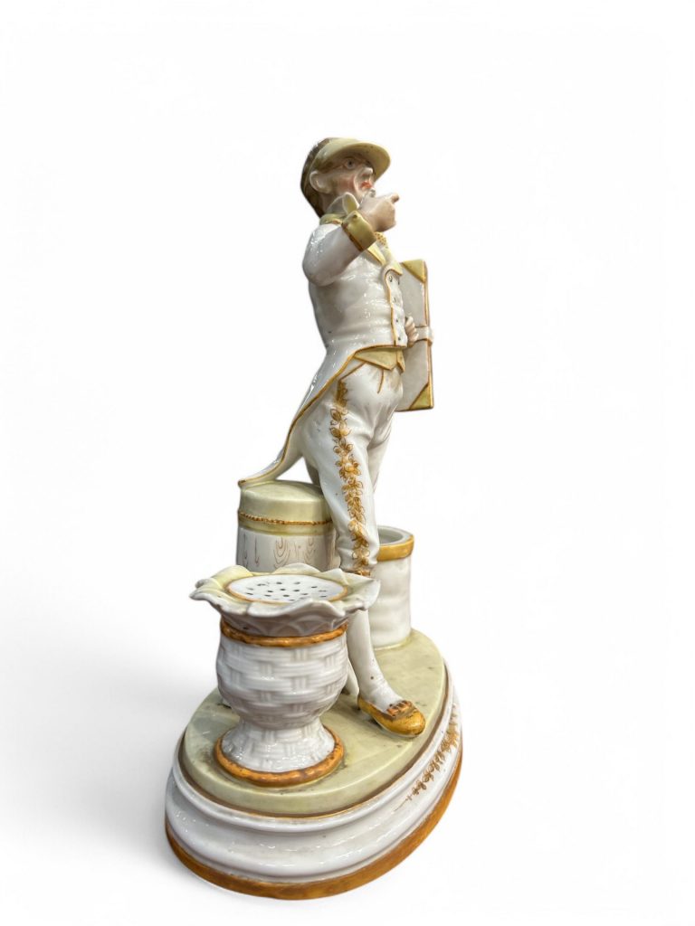 Elegante figurina in porcellana del XIX secolo, attribuibile alla prestigiosa manifattura di Meissen, probabilmente realizzata come porta stuzzicadenti. Il soggetto raffigura un gentiluomo con espressione teatrale, vestito con un raffinato abito decorato con dettagli dorati e un libro sotto il braccio. La base presenta due vani, uno con un coperchio formulato e l'altro a mo' di contenitore. L'oggetto è dipinto a mano, con decorazioni minuziose e dettagli dorati che arricchiscono l'opera. Sul fondo è presente il marchio KPM, utilizzato da diverse manifatture tedesche, rendendo questo pezzo di grande interesse per collezionisti e amanti della porcellana antica. Un pezzo affascinante, perfetto per impreziosire una collezione o un ambiente d’epoca.