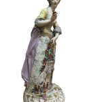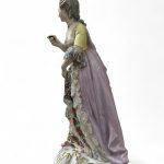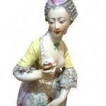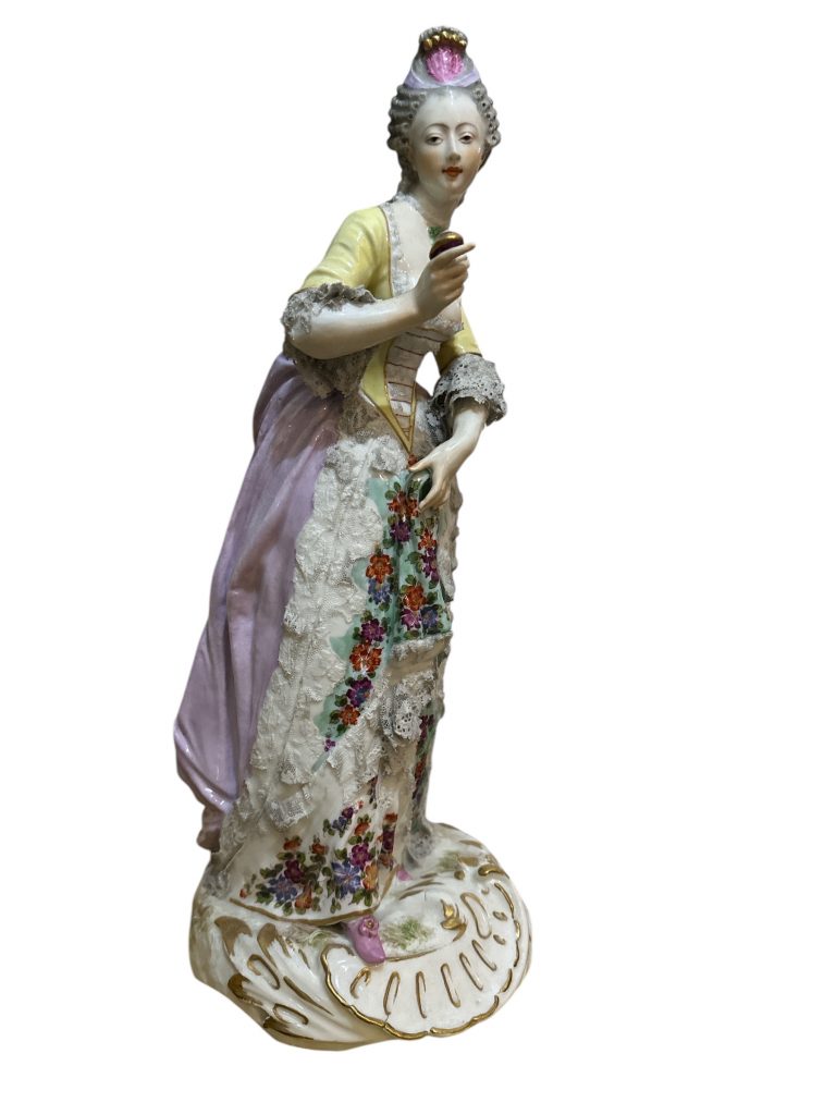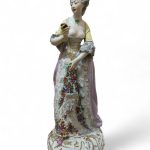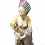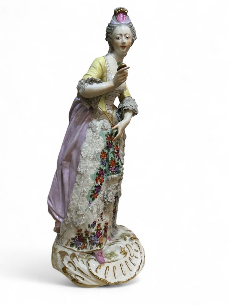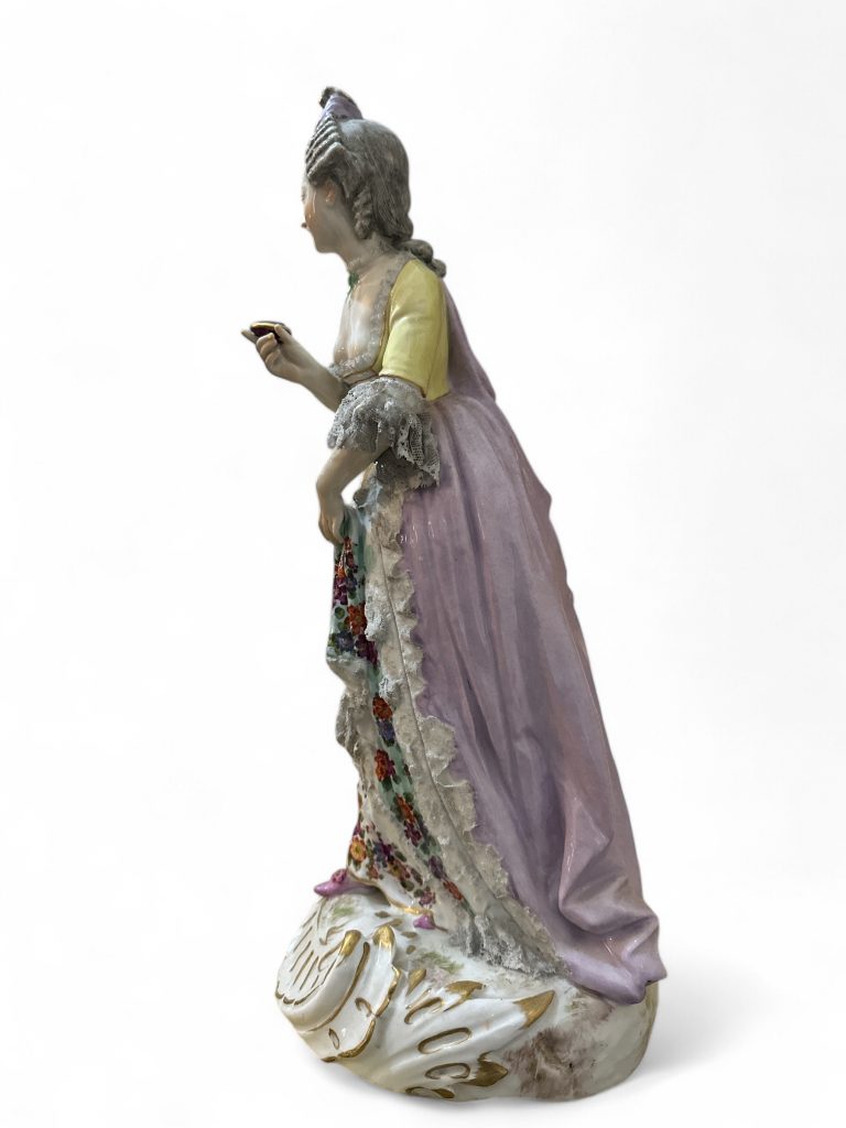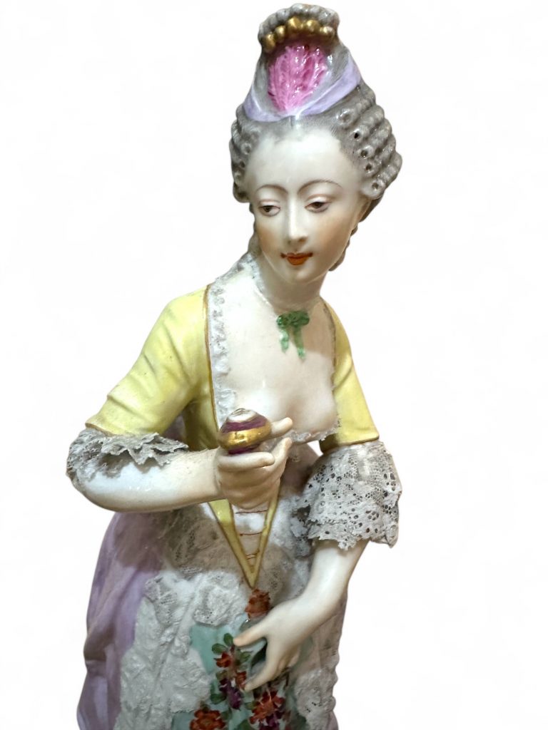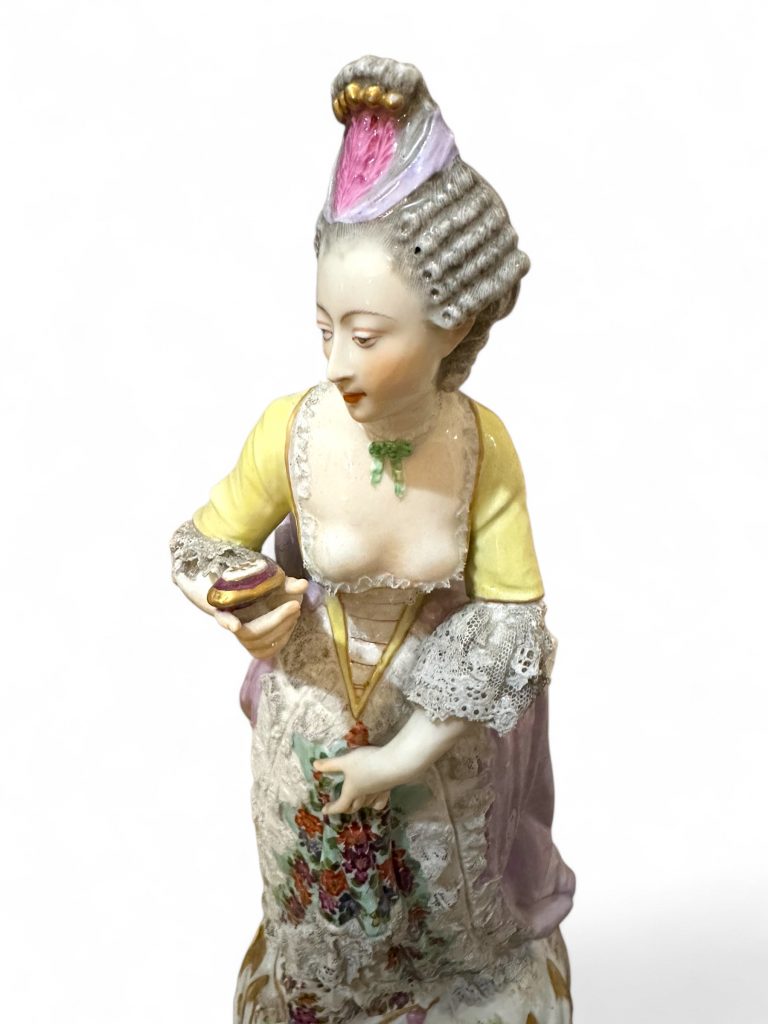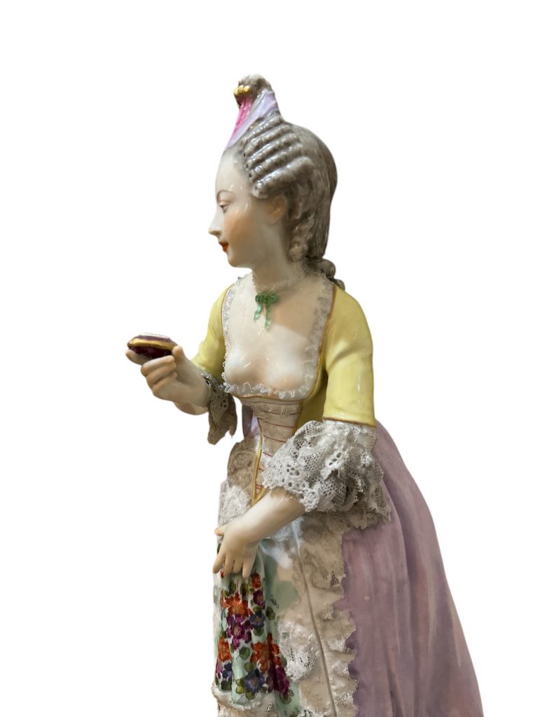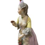 La statuetta raffigura una dama in abiti Rococò, caratterizzati da colori pastello (giallo, lilla, rosa, verde) e decorazioni floreali applicate con cura sulla gonna. La figura è in posa elegante, con una mano che solleva la veste e l’altra che regge una scatoletta, probabilmente per il trucco, come una cipria. Gli abiti presentano dettagli raffinati, inclusi inserti in porcellana traforata che imitano il pizzo, espressione della maestria artigianale. La base decorata con motivi dorati e bordi ondulati aggiunge ulteriore eleganza, mentre l’insieme trasmette leggerezza e movimento, tipici dello stile Rococò. Una creazione di alta qualità, probabilmente destinata a una committenza aristocratica o borghese.