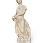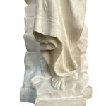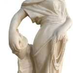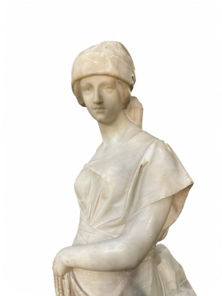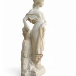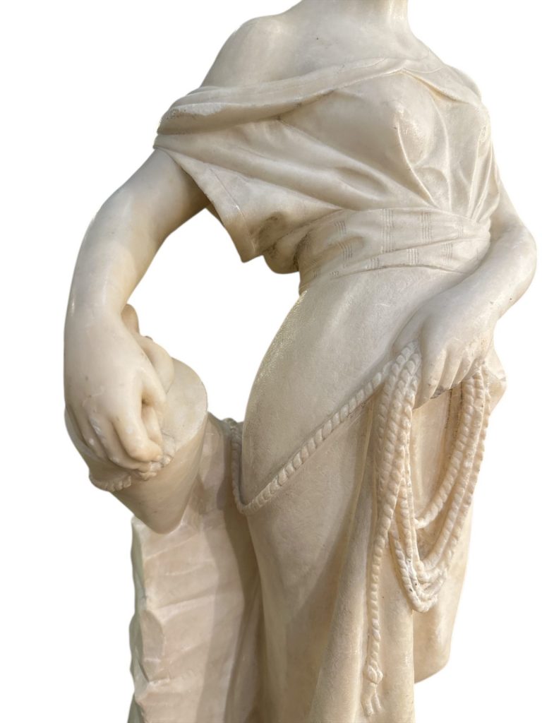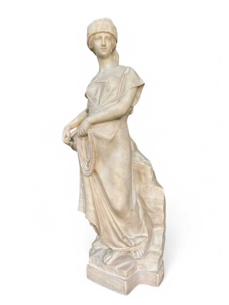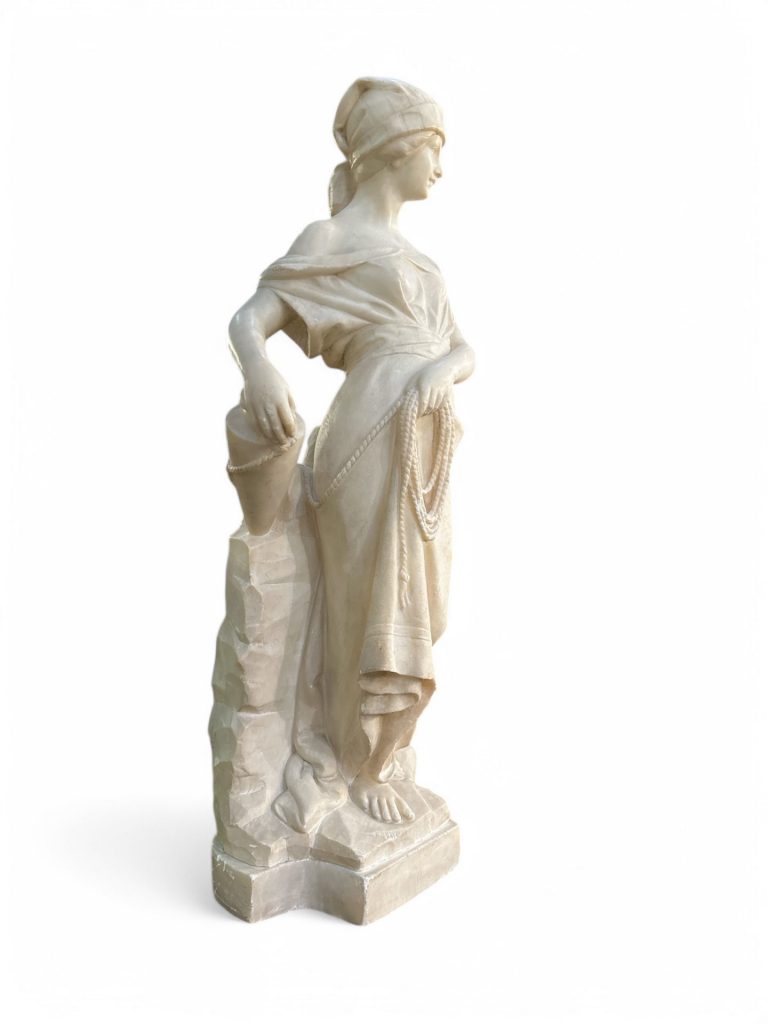 Statua in alabastro raffigurante una donna in abiti classici, realizzata nei primi decenni del XX secolo. La scultura si distingue per la raffinatezza dei dettagli e la grazia della figura femminile, scolpita con una postura armoniosa e un'espressione serena. La donna è avvolta in un morbido panneggio finemente lavorato, e tiene in mano un’anfora legata a una corda, particolare che conferisce dinamismo alla composizione. Il copricapo e gli elementi decorativi impreziosiscono ulteriormente questa splendida ed elegante opera.