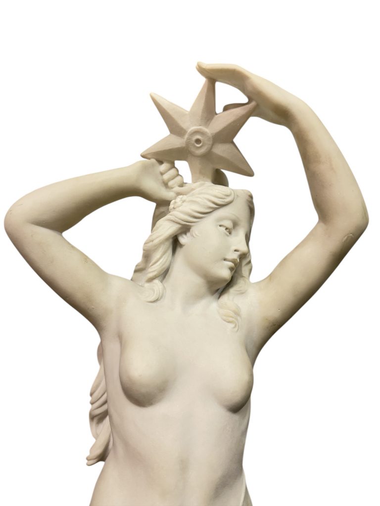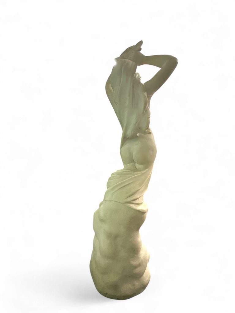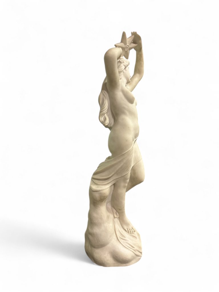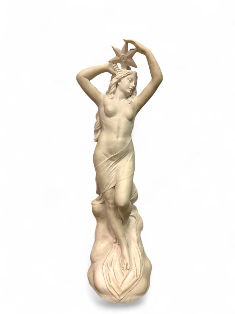 Questa raffinata scultura in marmo, risalente agli inizi del XX secolo, raffigura una figura femminile, una nuova Venere. La donna, avvolta in un drappo leggero che evidenzia la sinuosità del corpo, solleva le braccia verso il cielo per sostenere una stella, simbolo ricorrente nelle rappresentazioni di temi legati alla speranza, al sogno o all’astronomia. La base su cui poggia la figura è modellata come un’onda fluida, che conferisce un senso di movimento e dinamismo all’opera. Questa scultura è perfetta per chi cerca un elemento decorativo dallo stile classico, adatto a interni eleganti o a collezioni d’arte figurativa.