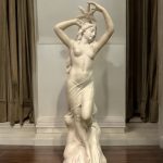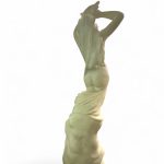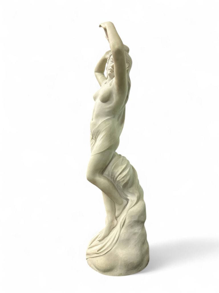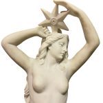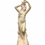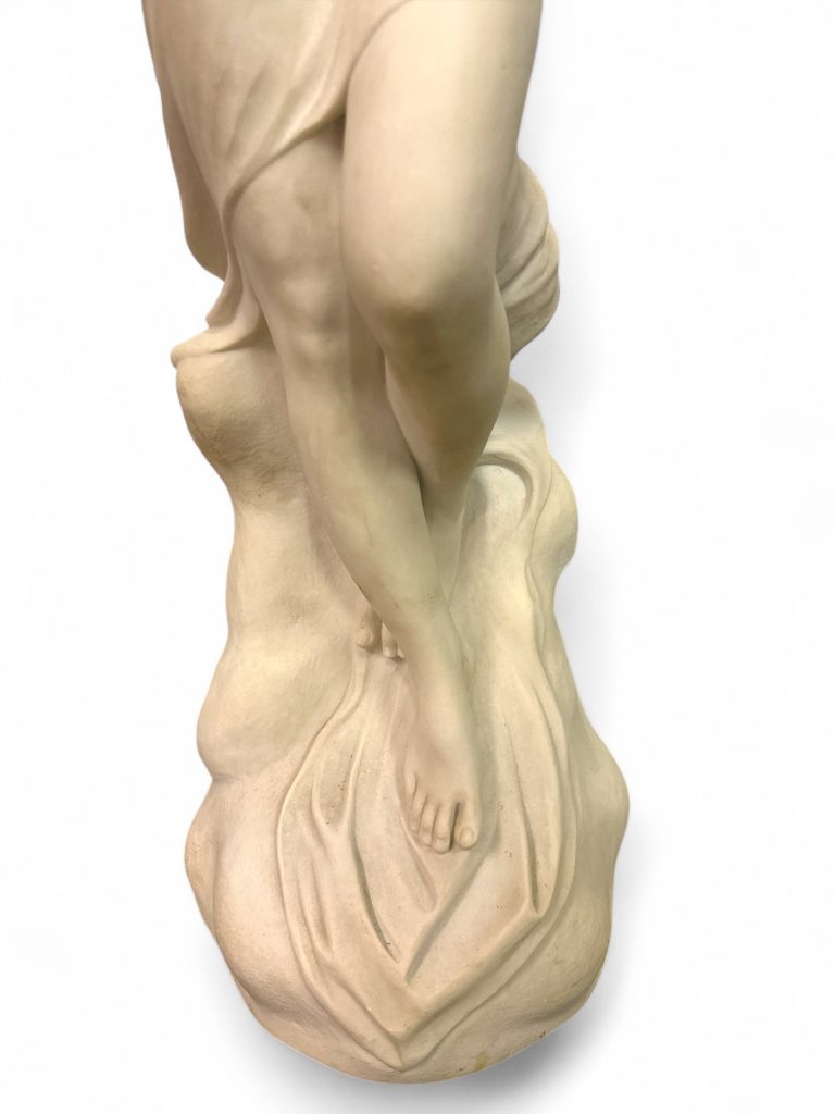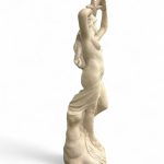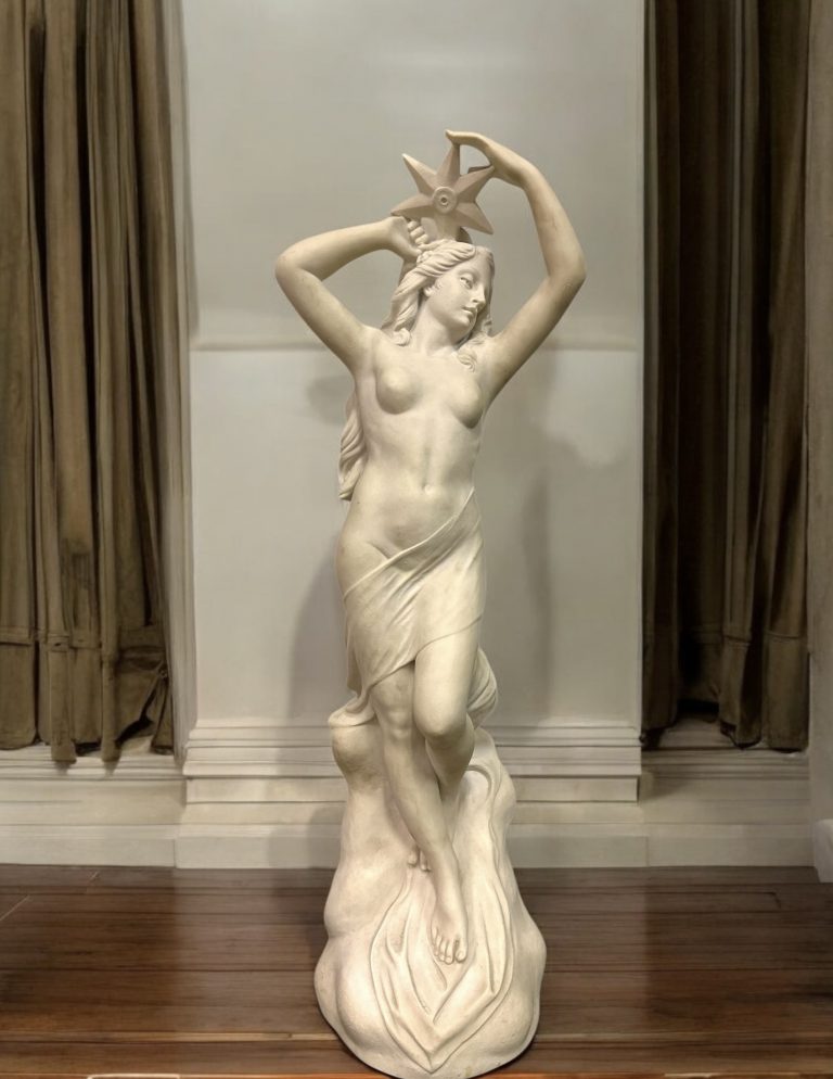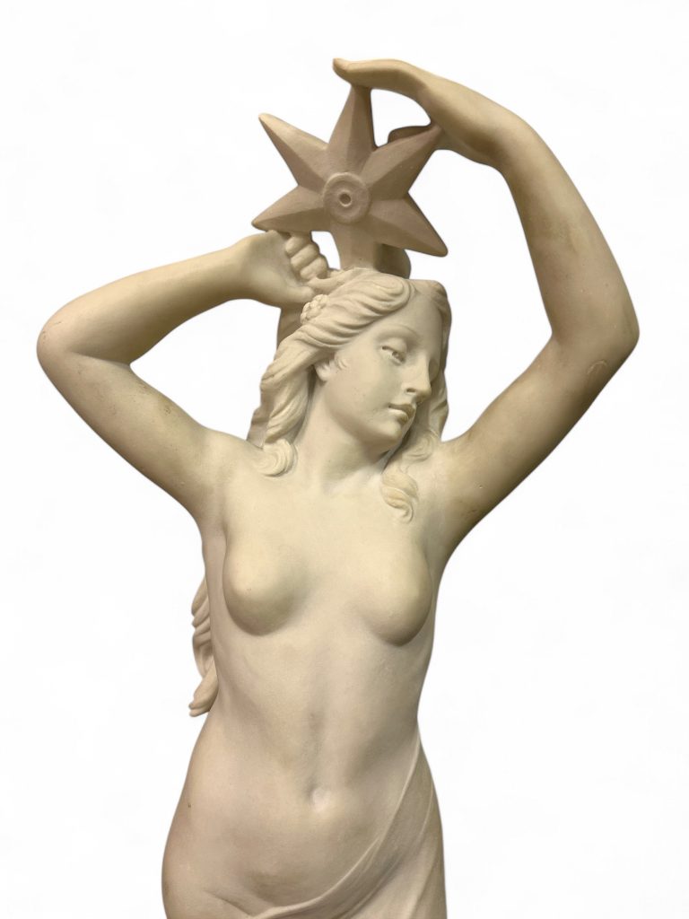 Questa raffinata scultura in marmo, risalente agli inizi del XX secolo, raffigura una figura femminile, una nuova Venere. La donna, avvolta in un drappo leggero che evidenzia la sinuosità del corpo, solleva le braccia verso il cielo per sostenere una stella, simbolo ricorrente nelle rappresentazioni di temi legati alla speranza, al sogno o all’astronomia. La base su cui poggia la figura è modellata come un’onda fluida, che conferisce un senso di movimento e dinamismo all’opera. Questa scultura è perfetta per chi cerca un elemento decorativo dallo stile classico, adatto a interni eleganti o a collezioni d’arte figurativa.
