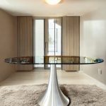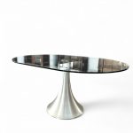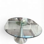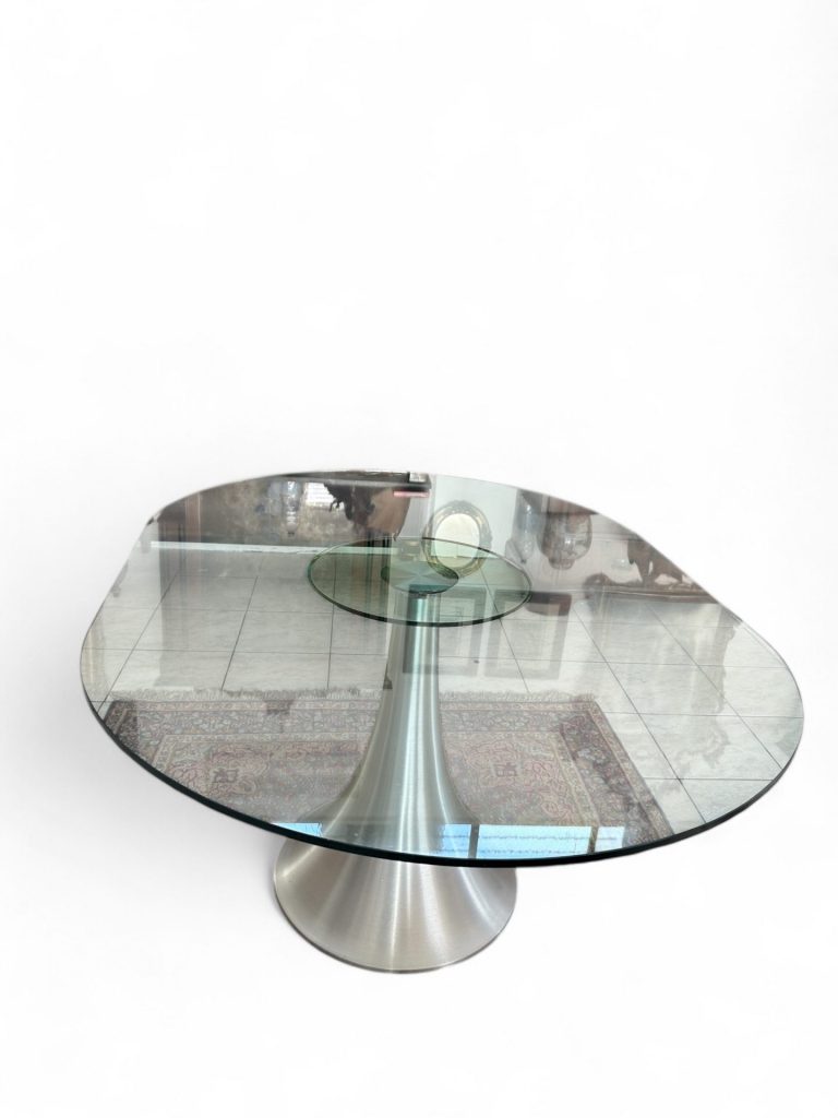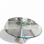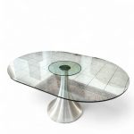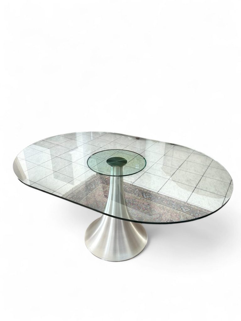 Tavolo con base in acciaio e piano in vetro