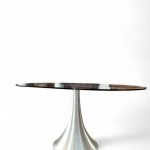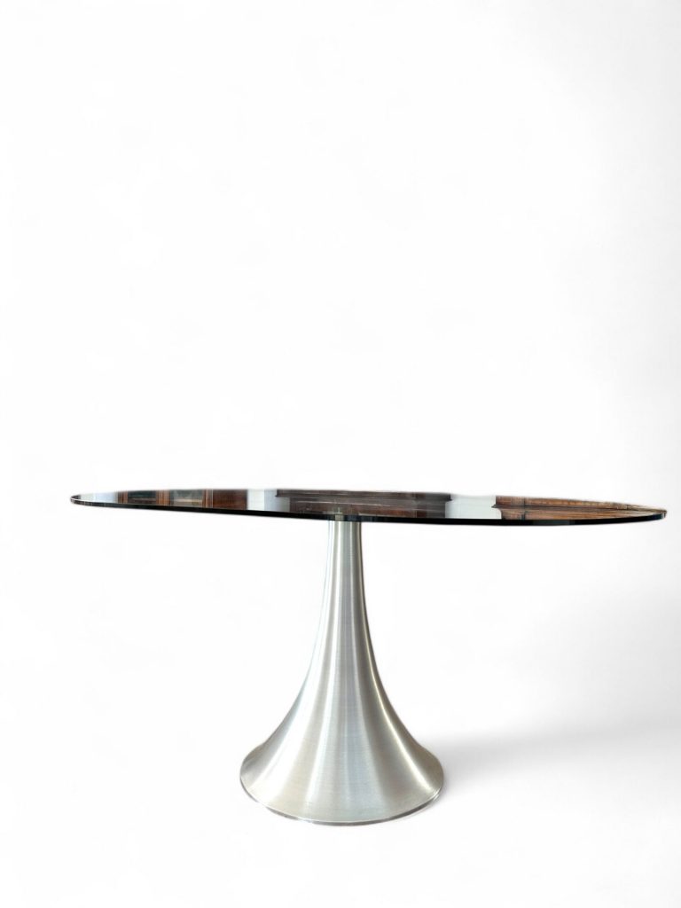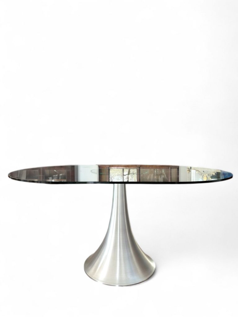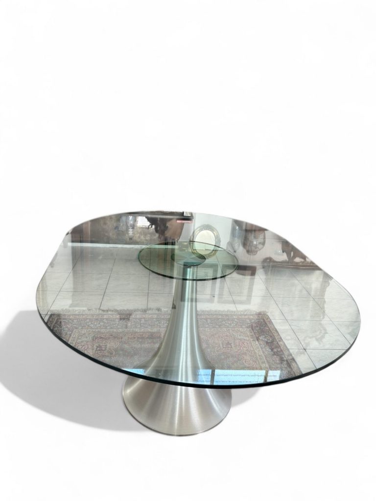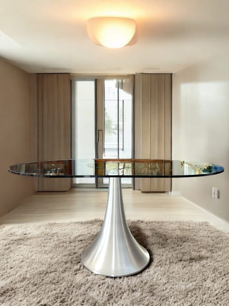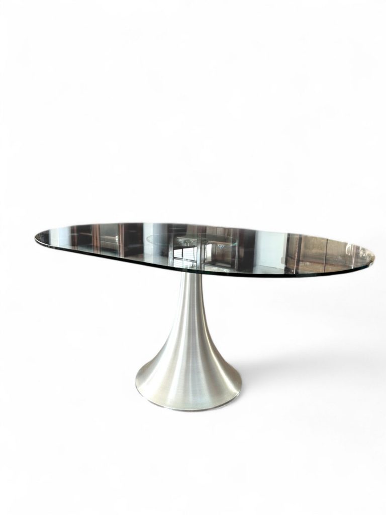 Questo tavolo di design moderno si distingue per la combinazione di materiali e linee contemporanee. Il piano è realizzato in vetro temperato trasparente che conferisce leggerezza visiva e permette di ammirare la struttura sottostante. La base, in acciaio spazzolato, ha una forma conica sinuosa che dona stabilità e carattere, evocando un’estetica minimalista e sofisticata.